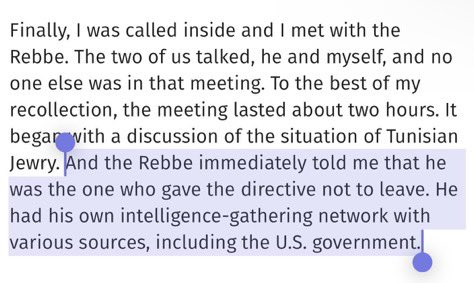 Finally, I was called inside and I met with the Rebbe. The two of us talked, he and myself, and no one else was in that meeting. To the best of my recollection, the meeting lasted about two hours. It begar with a discussion of the situation of Tunisian Jewry. And the Rebbe immediately told me that he was the one who gave the directive not to leave. He had his own intelligence-gathering network with various sources, including the U.S. government.
