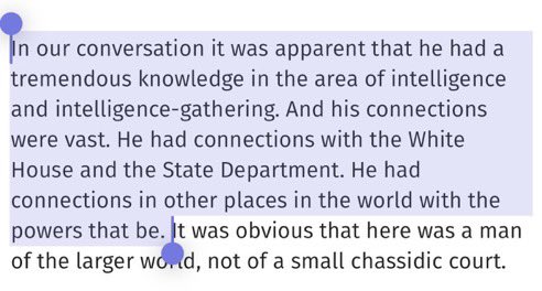 会話の中で、彼が諜報活動と情報収集の分野で膨大な知識を持っていることは明らかでした。そして、彼の人脈は広大でした。ホワイトハウスや国務省との繋がりがあり、世界各地の権力者とも繋がりがありました。彼が小さなハシディズムの宮廷の人間ではなく、より広い世界に属する人物であることは明らかでした。