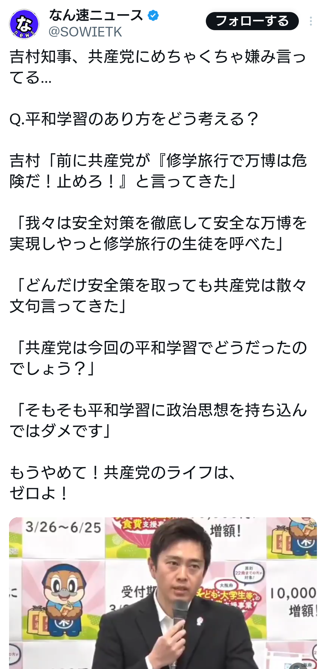 吉村知事「共産はどんだけ対策しても万博は危険と騒いだのに、なぜ死者が出た辺野古を批判しない?」