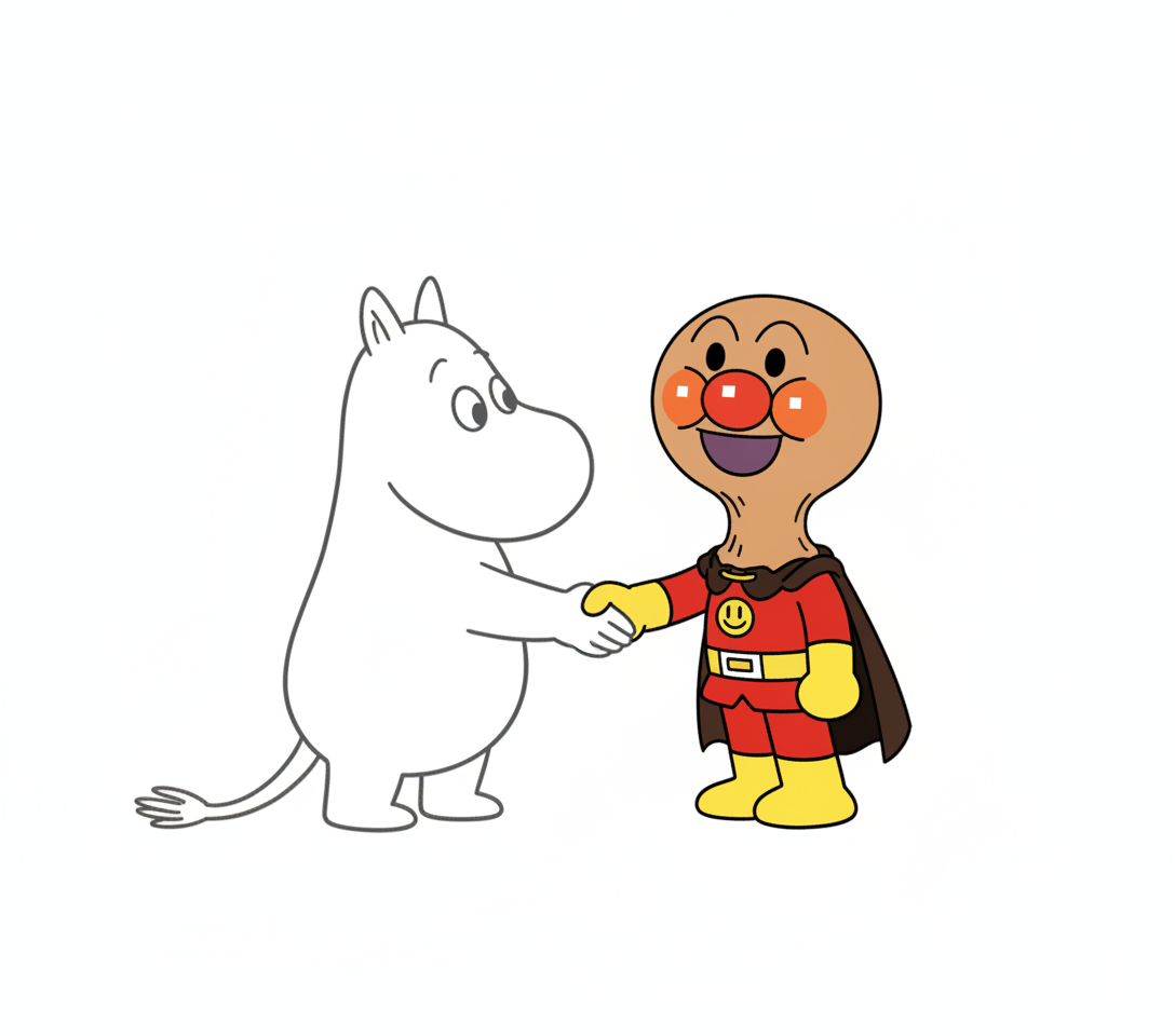 首の皮一枚繋がったアンパンマンがムーミンと握手