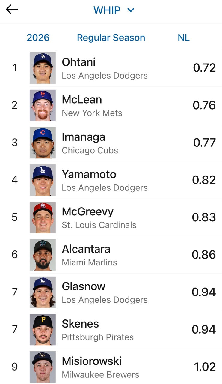 ナ・リーグWHIPランキング