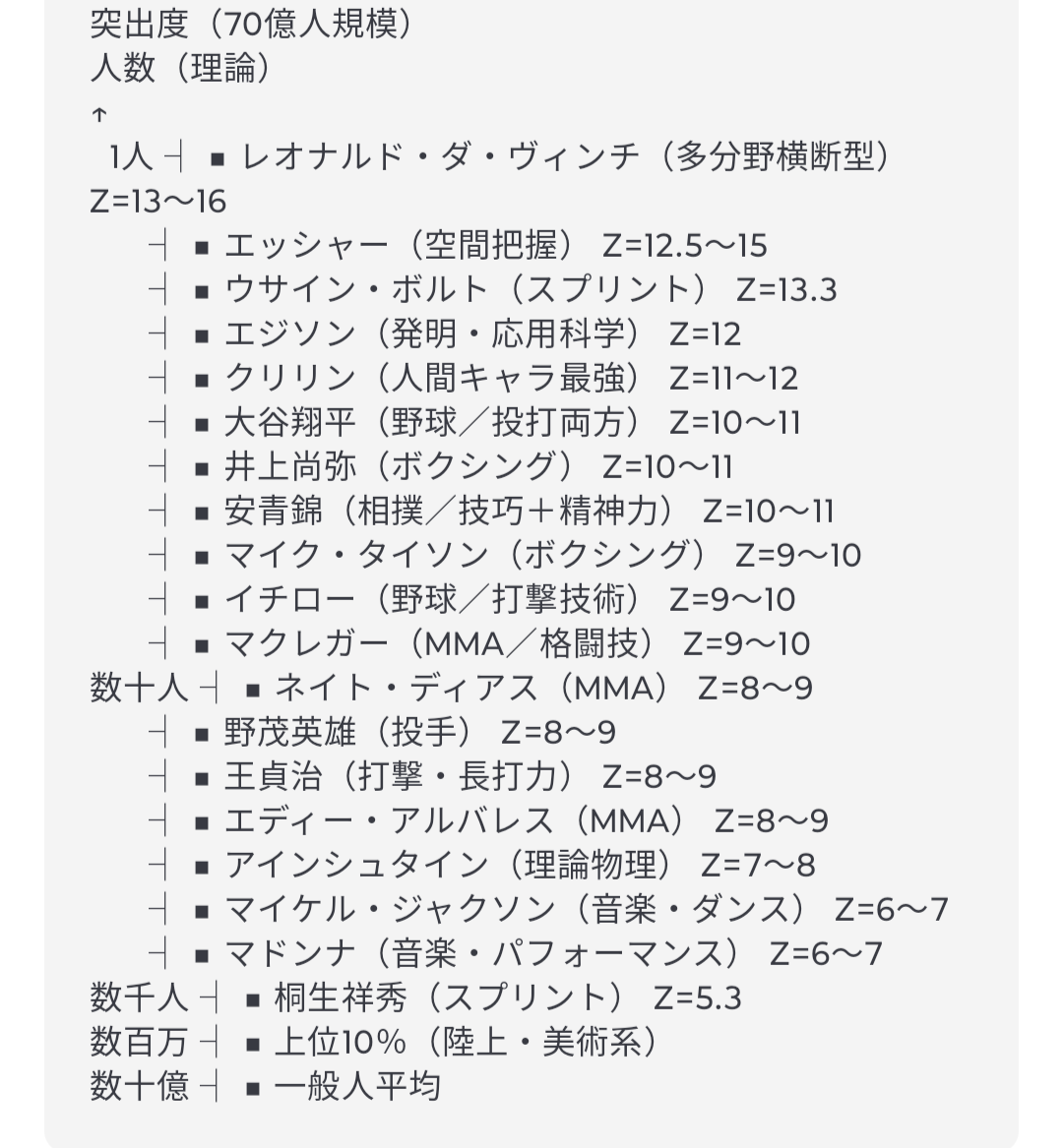 仮想Zスコア:Z=11~12(エッシャーやダ・ヴィンチには及ばないが、人間キャラとしてはトップクラス)