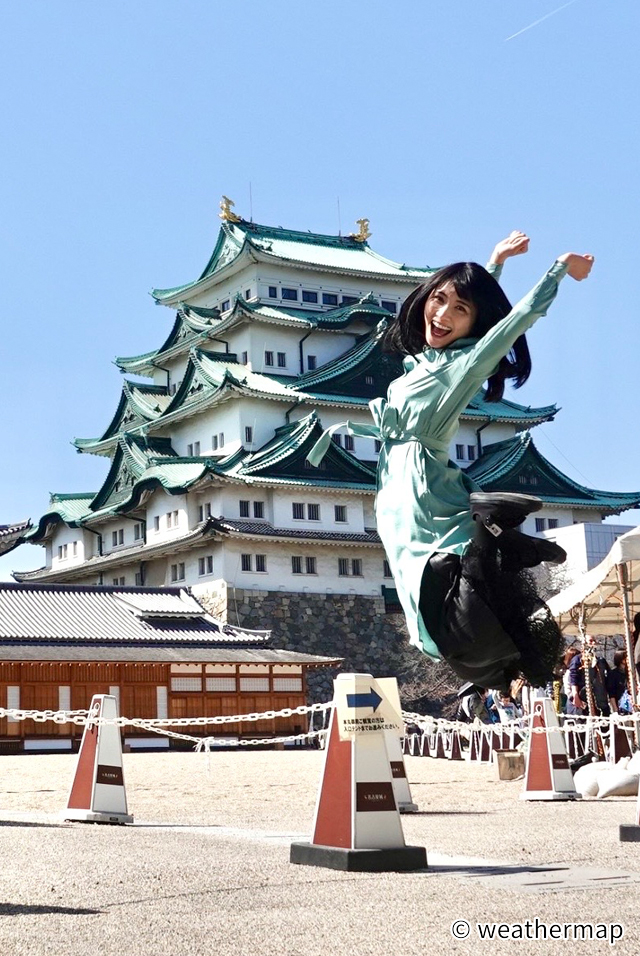 お城の写真の邪魔をする久保井さん