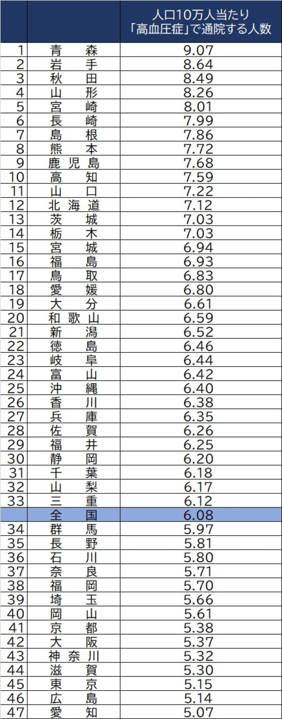 10万人あたり高血圧通院数ランキング