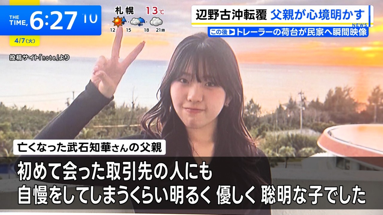 辺野古沖転覆事故で亡くなった武石知華さんの父親がnoteで情報発信、学校の対応の問題点指摘…「初めて会った人にも自慢をしてしまうくらい、明るく、優しく、聡明な子」 : 読売新聞 https://share.google/H9S8hdXLbHBfquAcg