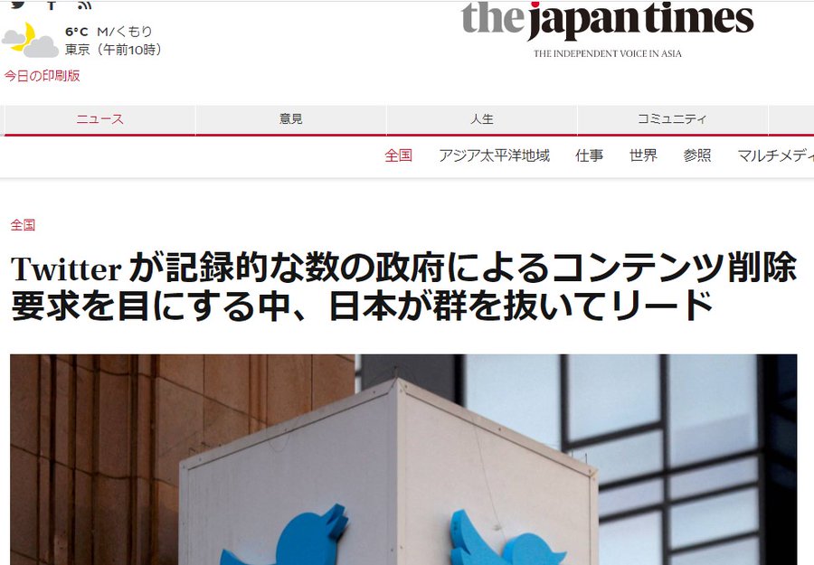 ツイッター社の報告によると、世界中の政府からコンテンツ削除を求める法的要求があったが「その中で最も多いのは日本からの要求であった」主にジャーナリストや報道機関の投稿を削除するよう要請。