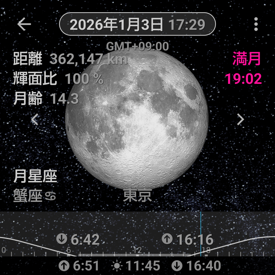 今日の未明に見た時、てっきり満月やと思ってたわ。今夜なんや