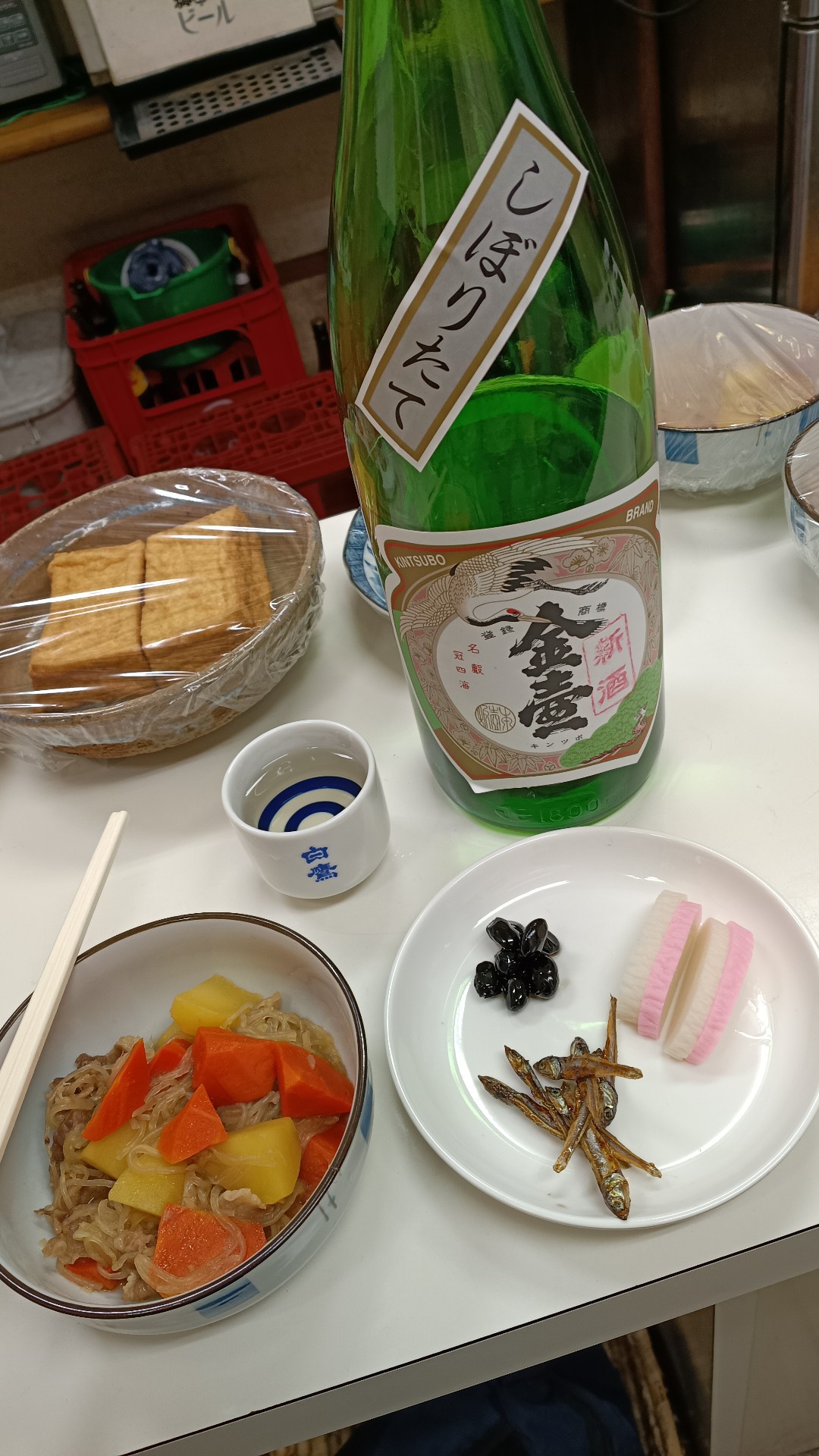 今日角打ちに飲みに来たらプチおせちが出てきた