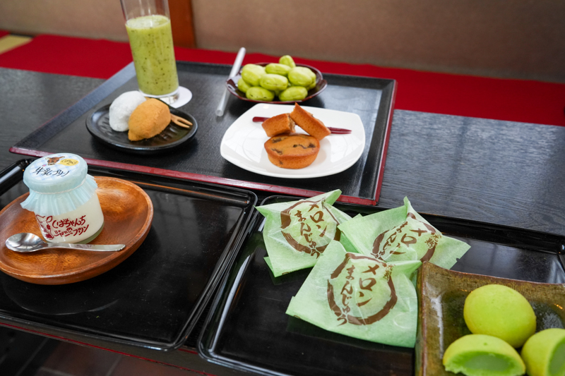 永瀬九段:小夜乃梅抹茶小最中、掛川栗のマロンシェ、完熟メロンまんじゅう、振袖餅、しばちゃんちの牛乳プリン、フレッシュジュース(キウイ)