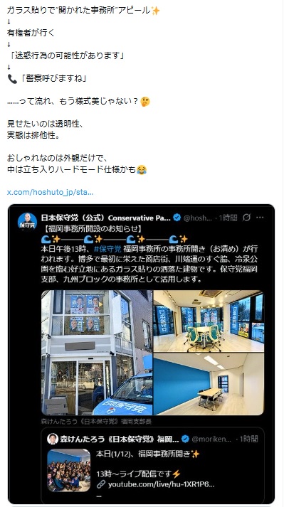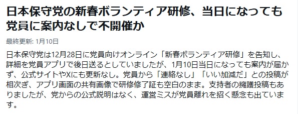 予定されていた、日本保守党のボランティア研修が告知ないまま開催されなかったのって、