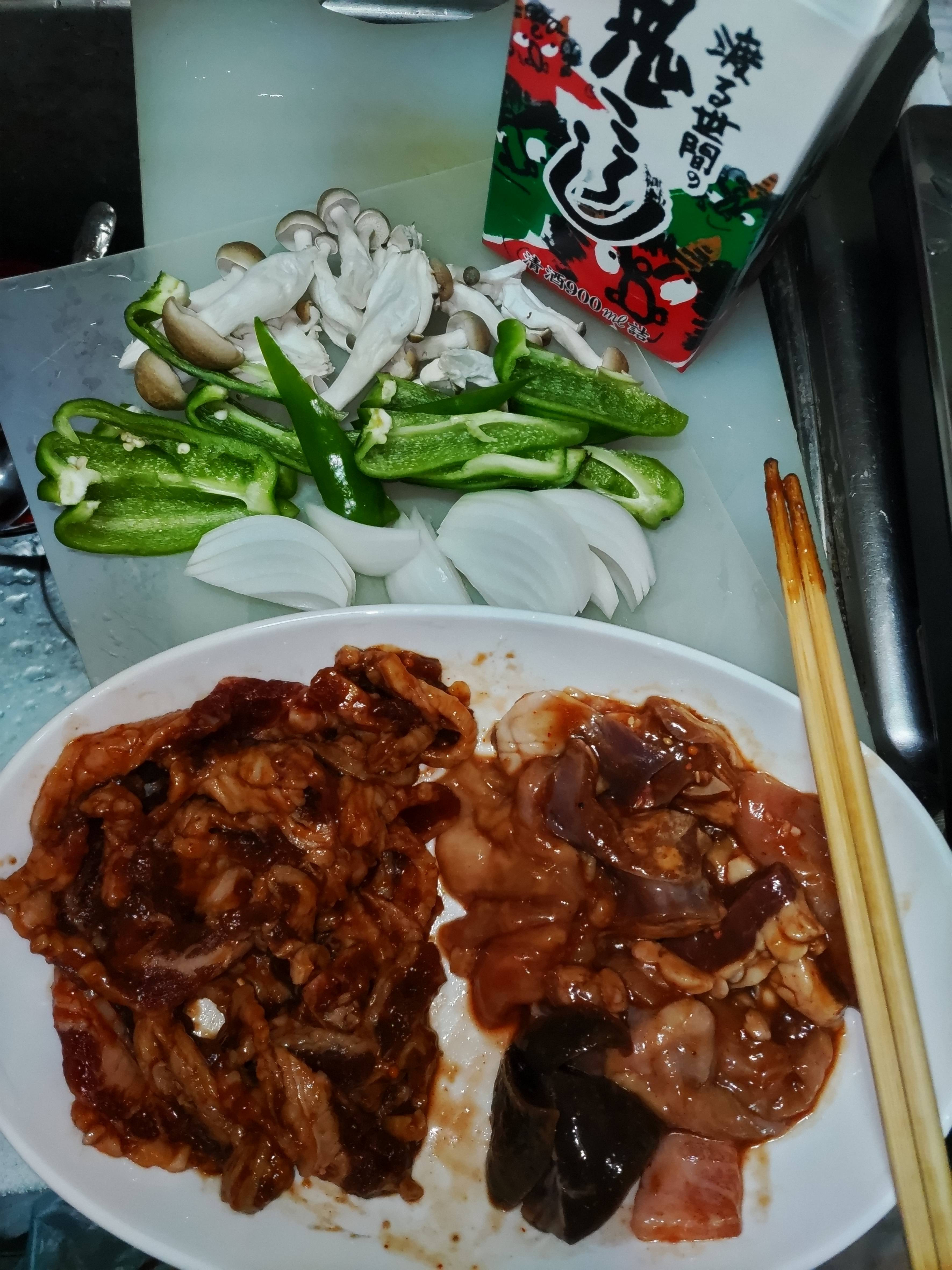 生肉と炒めた色合いが画像では同んなじで…美味そうに見えん↷😳俺として 今年一番美味い“肉野菜炒め定食”の晩飯でございます🍖🥦